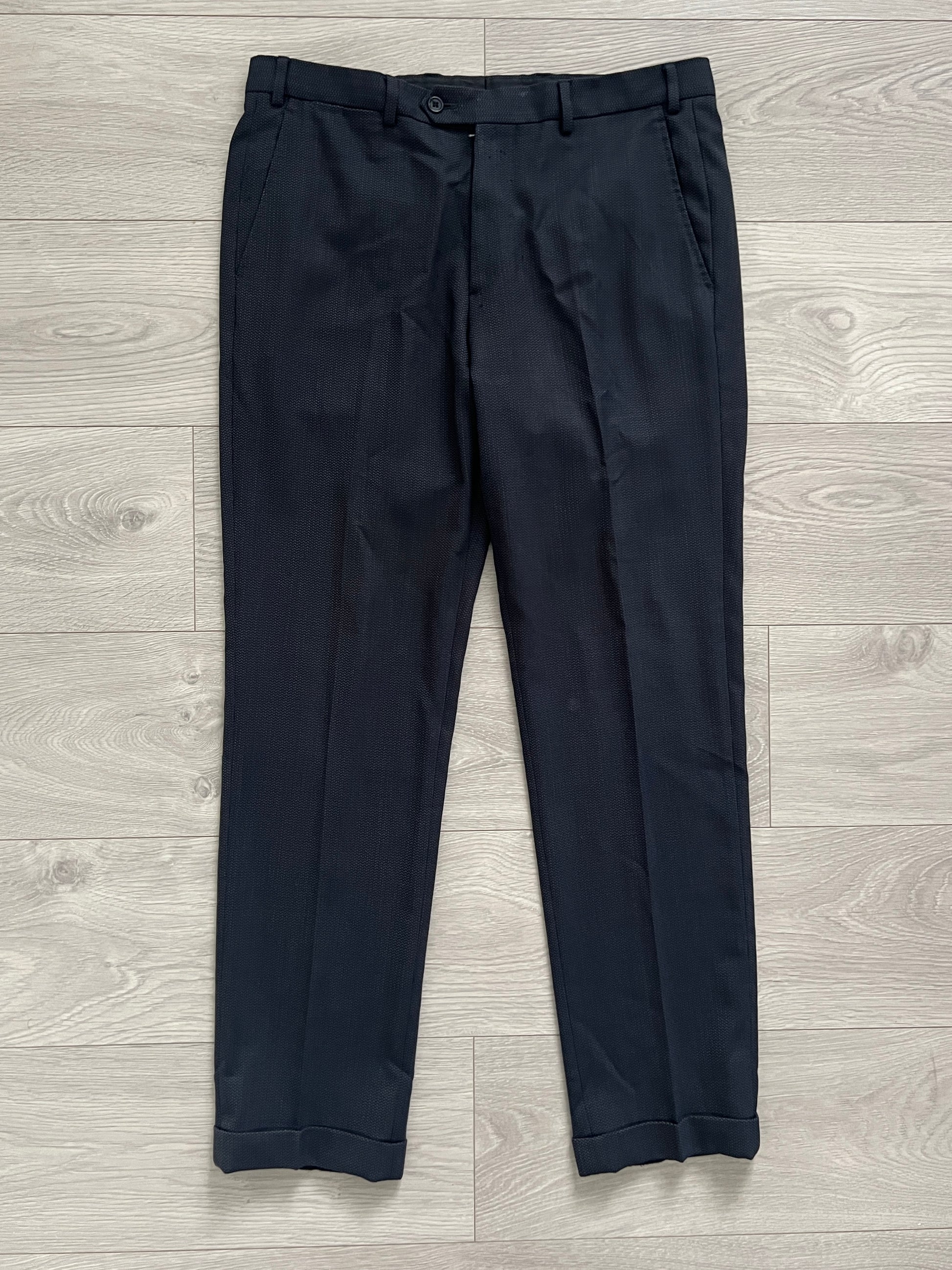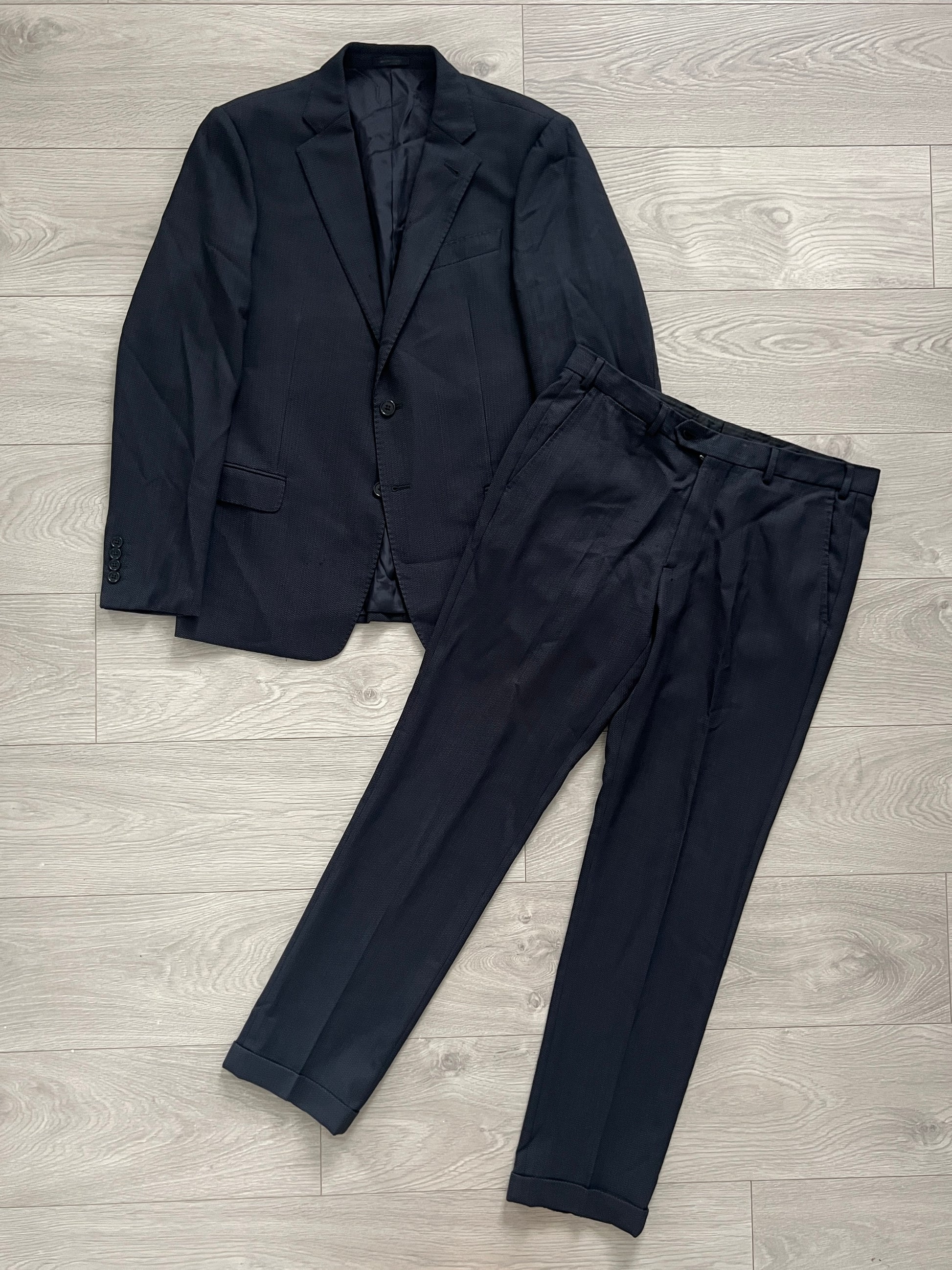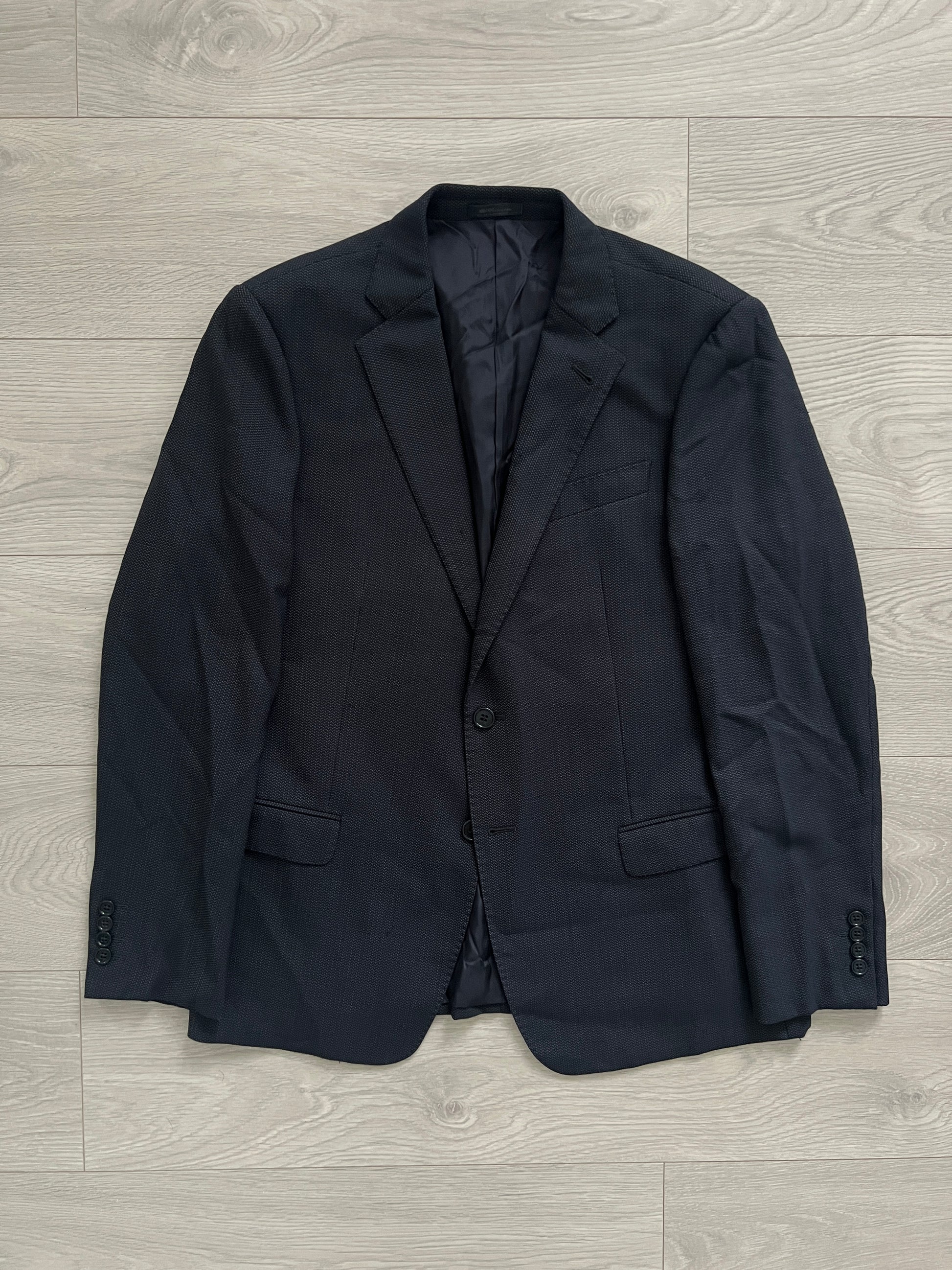 Armani Wool Pleated Blue Textured Suit - Size L Jacket / 34" Waist